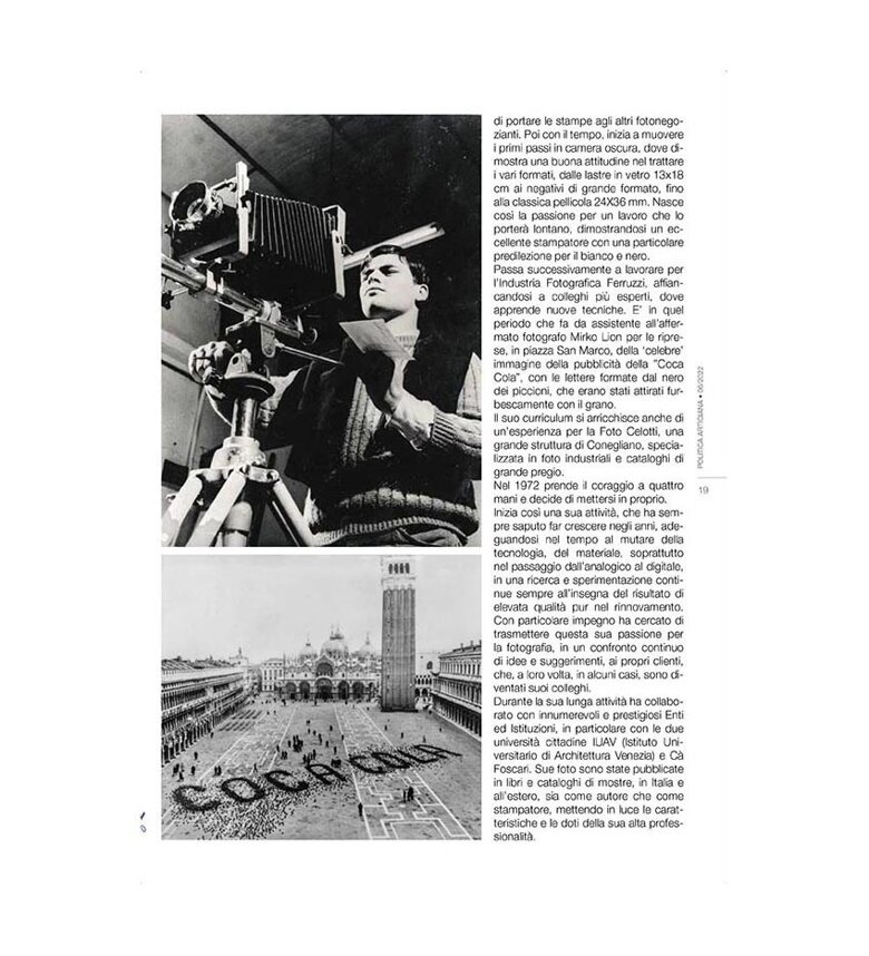 Passa successivamente a lavorare per l’Industria Fotografica Ferruzzi, affiancandosi a colleghi più esperti, dove apprende nuove tecniche. E' in quel periodo che fa da assistente all'affermato fotografo Mirko Lion per le riprese, in piazza San Marco, della 'celebre' immagine della pubblicità della ”Coca Cola”, con le lettere formate dal nero dei piccioni, che erano stati attirati furbescamente con il grano Il suo curriculum si arricchisce anche di un'esperienza per la Foto Celotti, una grande struttura di Conegliano, specializzata in foto industriali e cataloghi di grande qualità.
